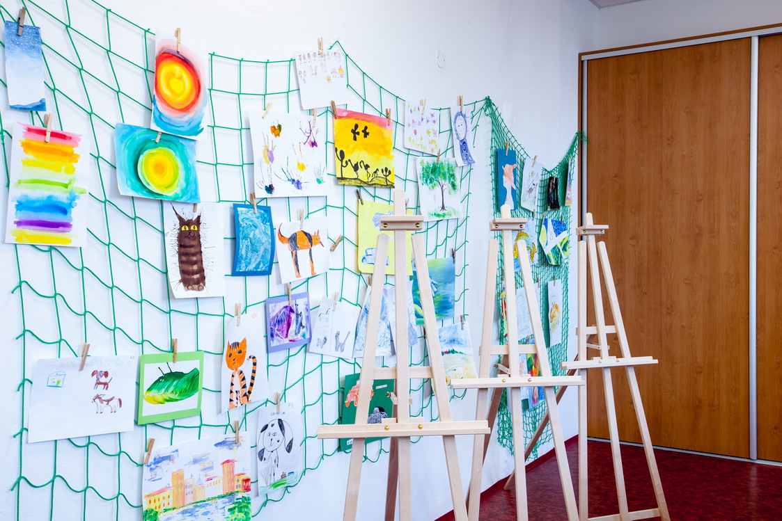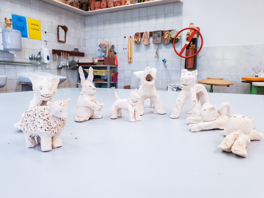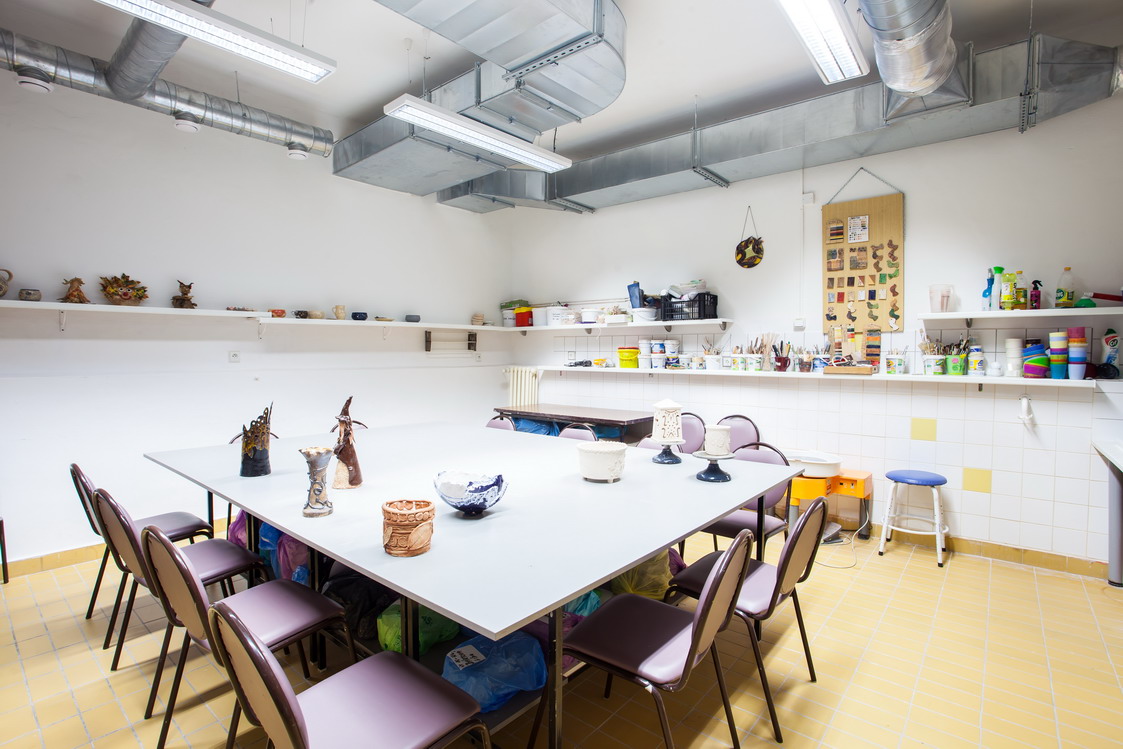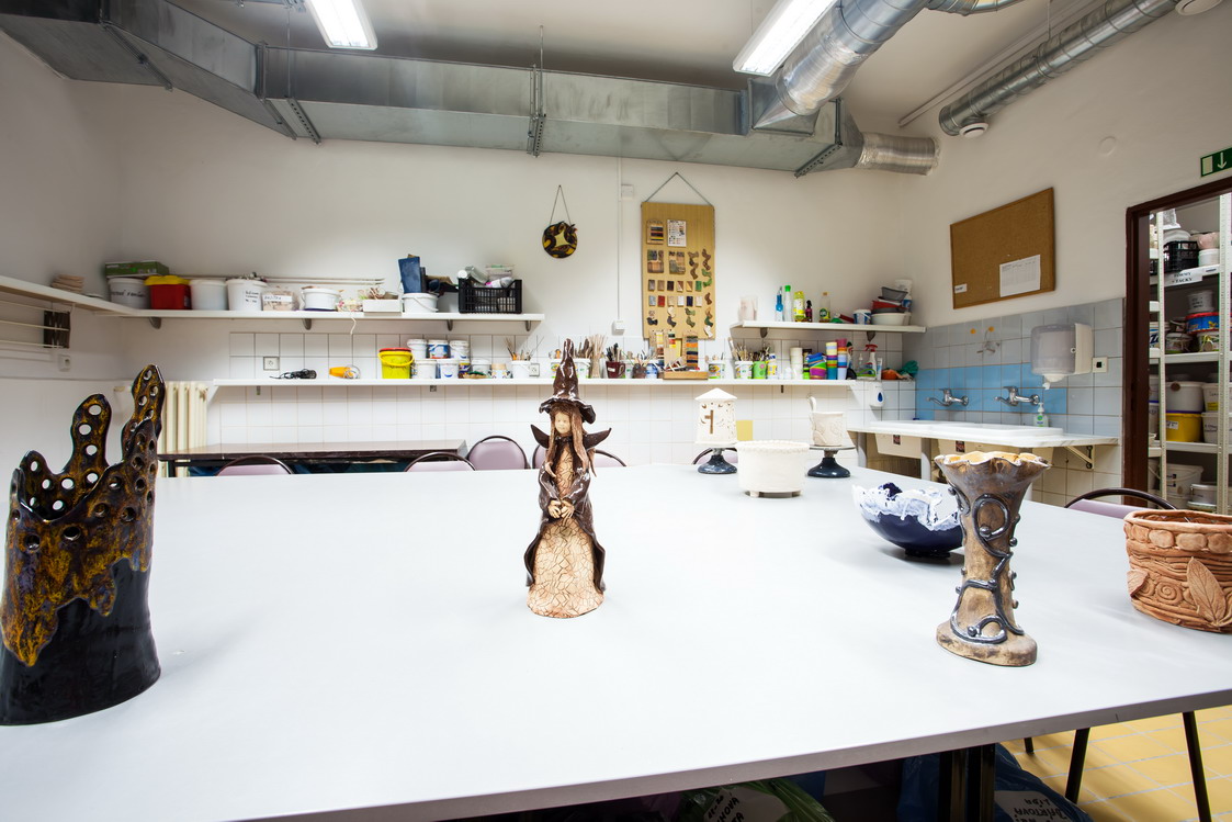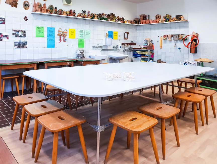 Popis: Dominantou keramické dílny je středový stůl pro kolektivní využití, kolem něhož je situováno12 pracovních míst pro děti, 8 pracovních míst pro dospělé. Každé z těchto pracovních míst skýtá dostatečný prostor pro jednoho klienta. V odděleném pracovním prostoru jsou umístěny glazury, engoby a další materiál a pomůcky. V další pracovní místnosti je umístěná keramická vypalovací pec, kde se výrobky suší, pálí a skladují pro další technické zhodnocení, jako glazování. Tyto prostory však nejsou klientům přístupné z důvodu bezpečnosti.