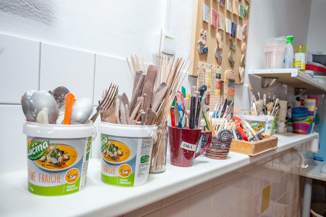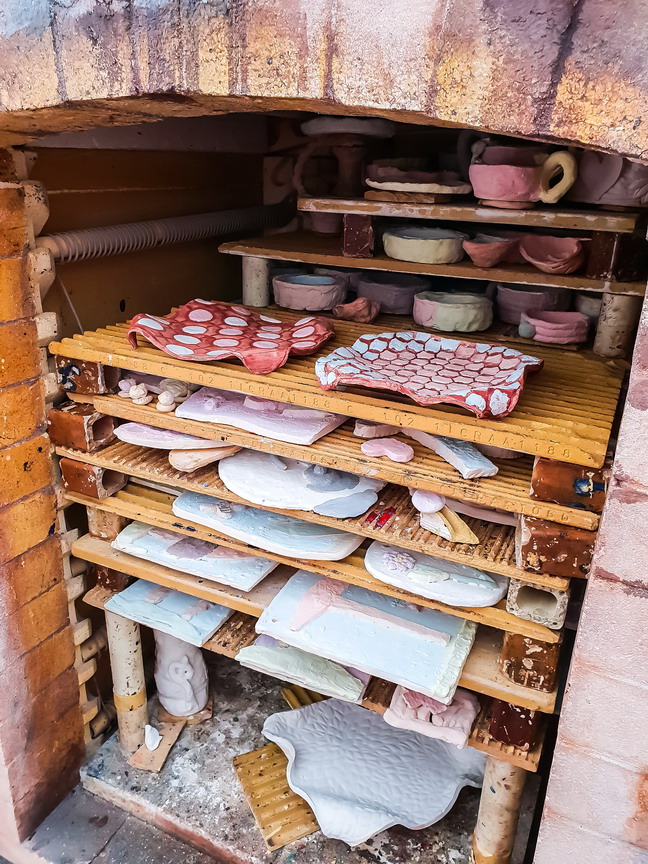 V sousední pracovní místnosti je umístěná keramická vypalovací pec, kde se výrobky suší, pálí a skladují pro další technické zhodnocení, jako glazování. Tyto prostory nejsou klientům příštupné z důvodu bezpečnosti.