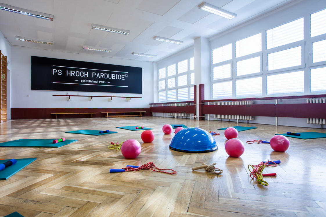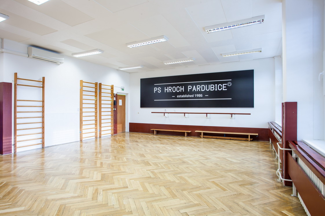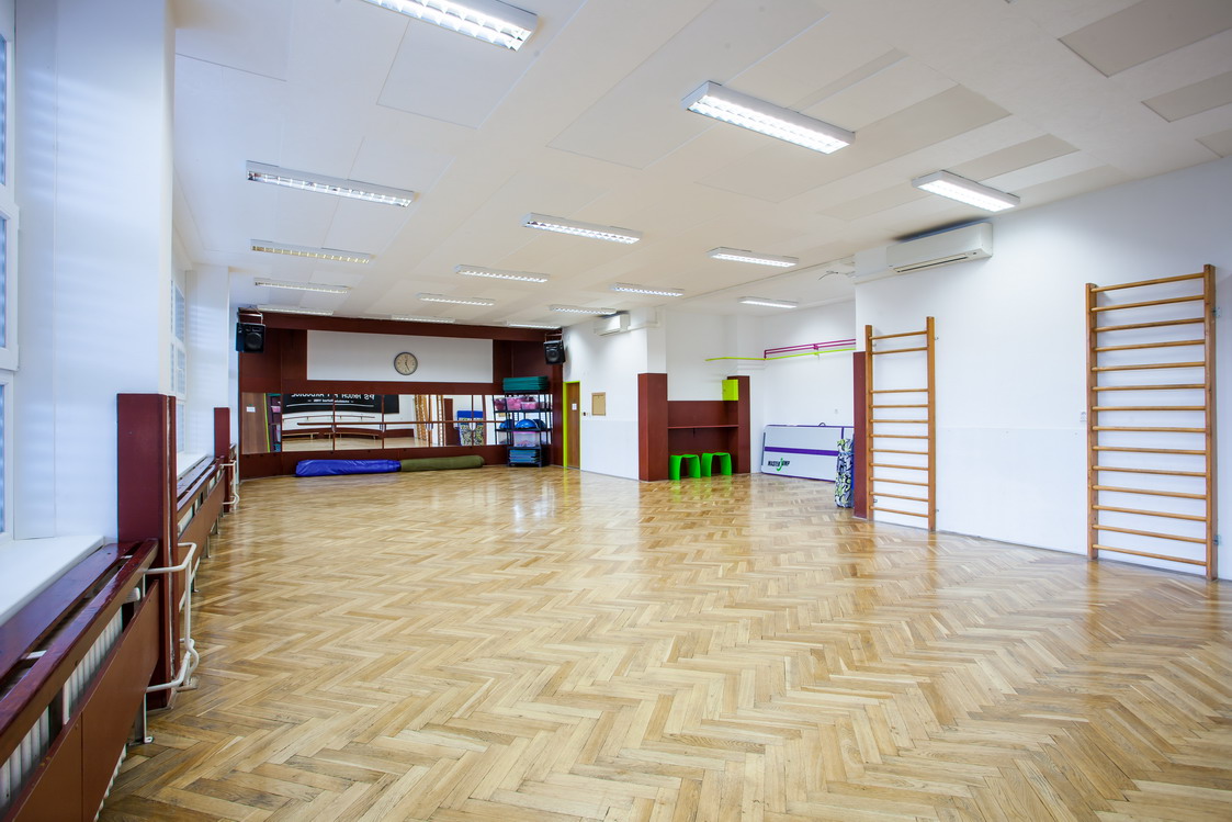 Popis: Zrcadlový sál je vybaven hudební aparaturou, parketovou podlahou, klimatizací. K dispozici je cvičební nářadí (žíněnky, gymn.koberce, lavičky, odrazové můstky, airtrack) a posilovací náčiní (činky, overbally, bosu, švihadla...). V předsálí nalezneme také 4 šatny, umývárny a WC.
