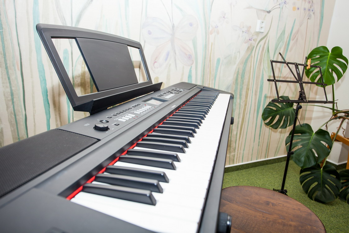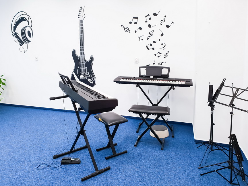 Popis: V hudebně je k dispozici především velké koncertní křídlo August Förster, dále elektrické piano zn. Yamaha a čtveřice akustických kytar. Nalézt zde můžeme také množství literatury s hudební tématikou. Prostor se také hodí k výuce ostatních hudebních nástrojů, např. fléten.