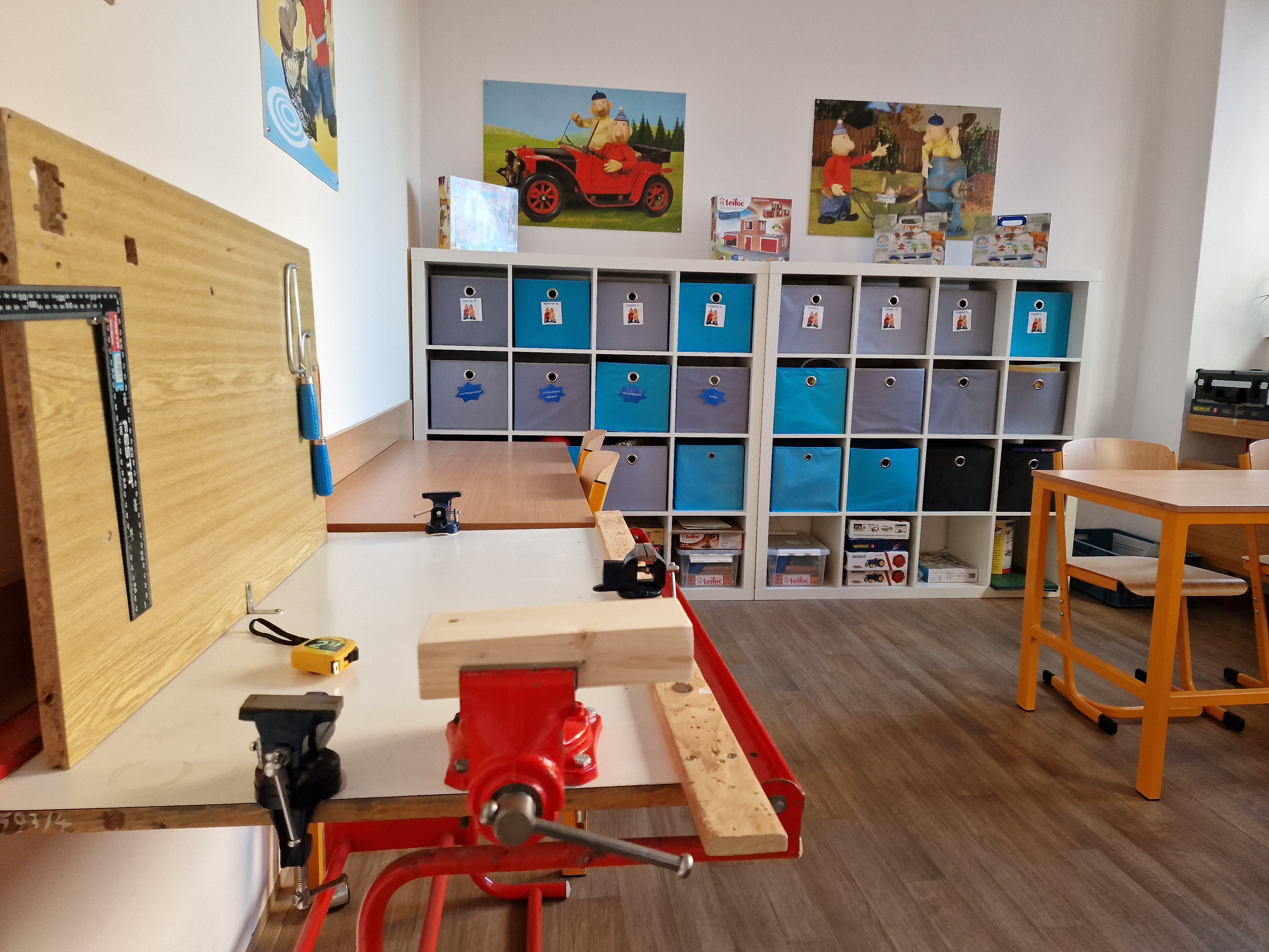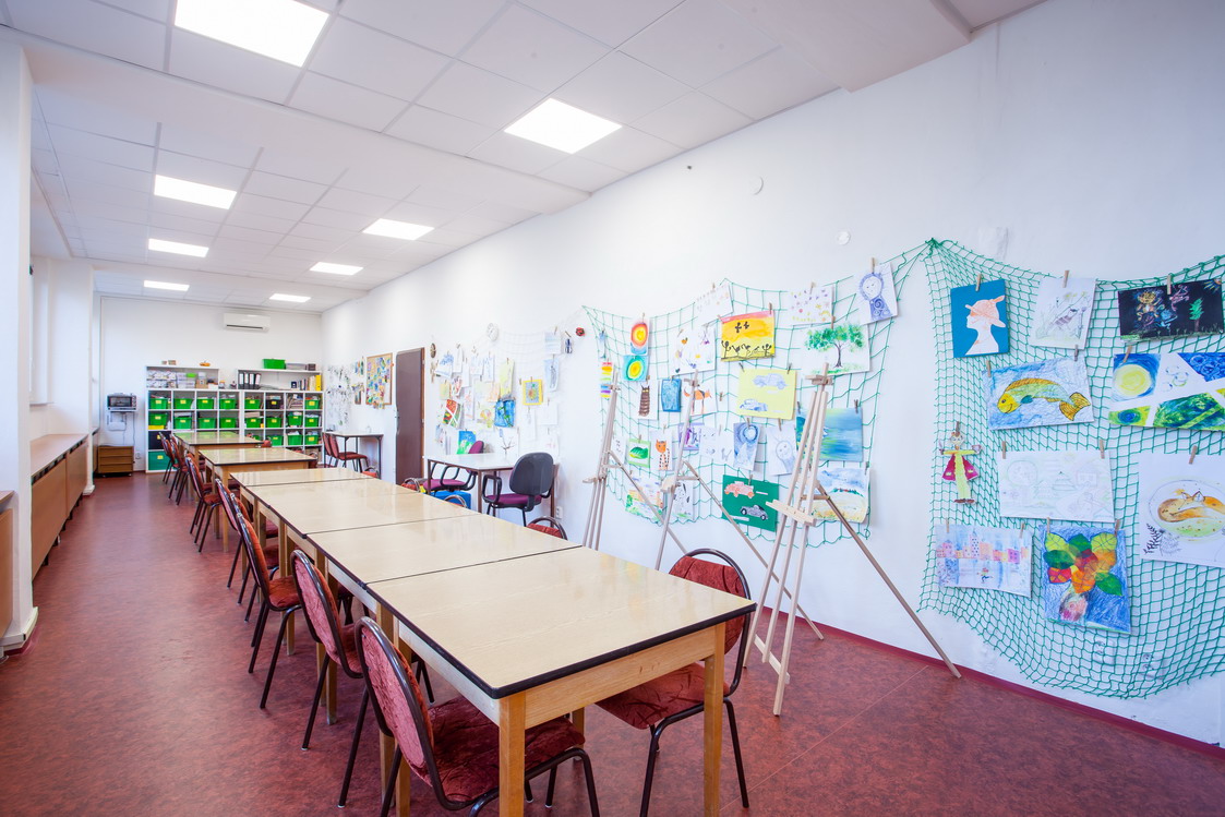 Popis: Místnost je vybavena 20 pracovními místy, které poskytují dostatečný prostor pro jednoho účastníka, maximální kapacita je však 28 při využití bočních pracovních ploch. V oddělené části ateliéru je umyvadlo a výlevka určená pro výtvarné aktivity. V ateliéru lze využít malířské stojany. Ateliér je vybaven vlastní klimatizační jednotkou.