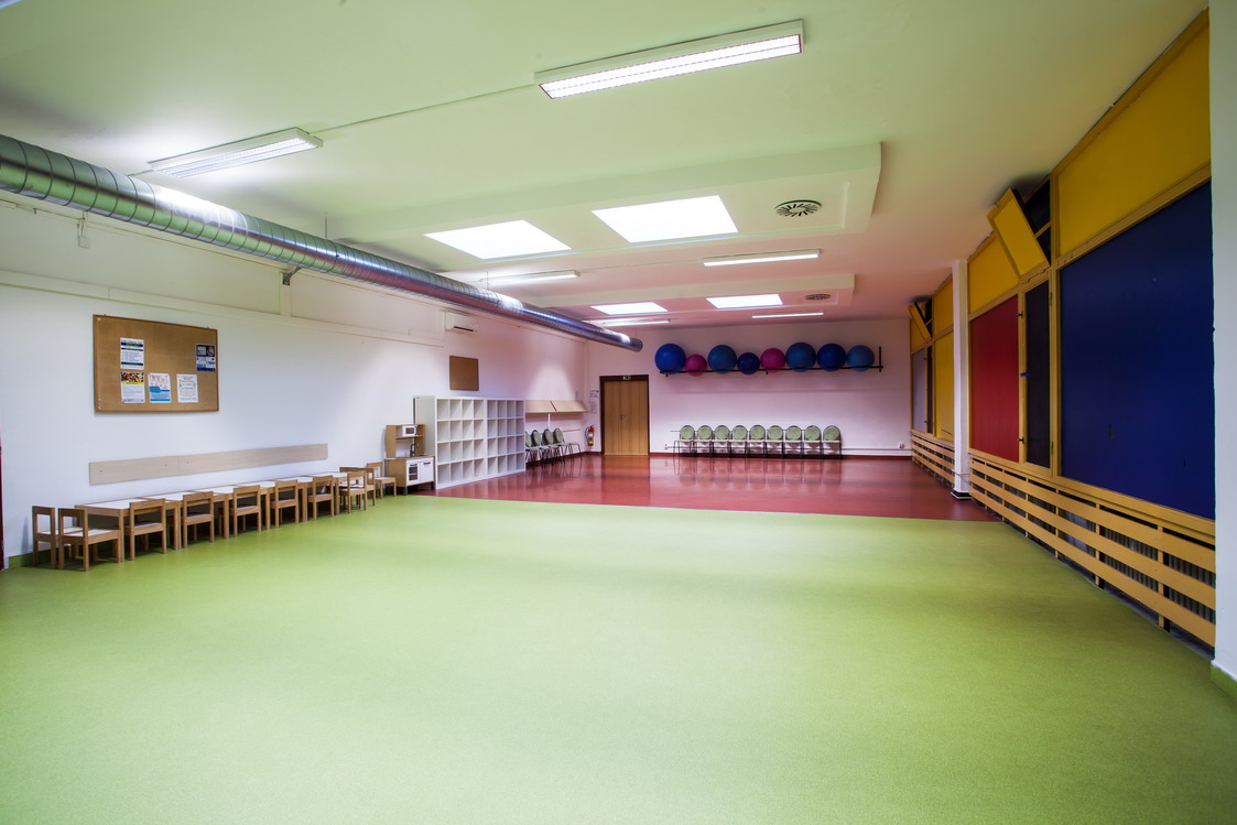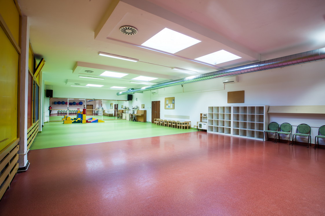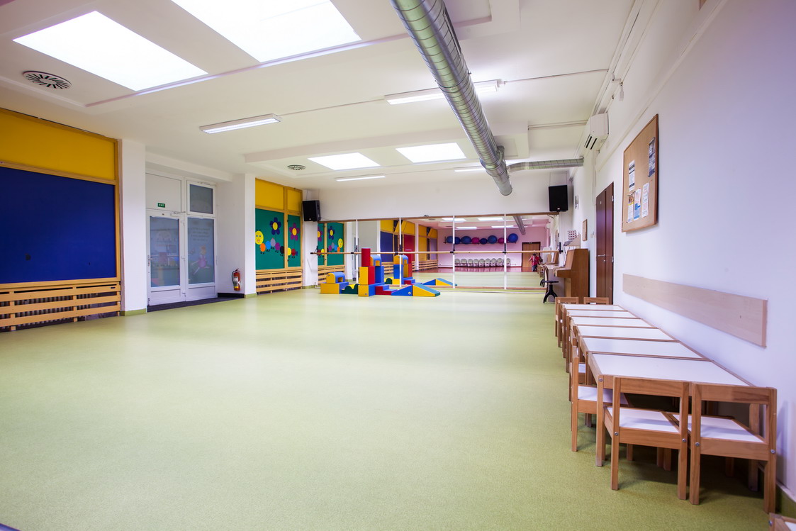 Popis: Zrcadlový sál je vybaven hudební aparaturou, pianinem, klimatizací, k dispozici je gymnastické náčiní (žíněnky, gymnastické koberce, overbally, molitanové kostky – stavebnice na hraní). V předsálí je šatna, umývárna, sprcha, WC, kuchyňka, malé dětské stolky a židličky)