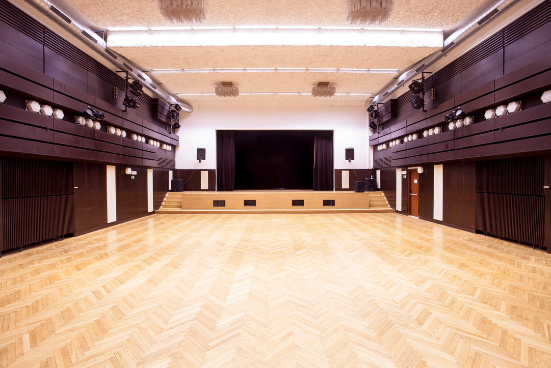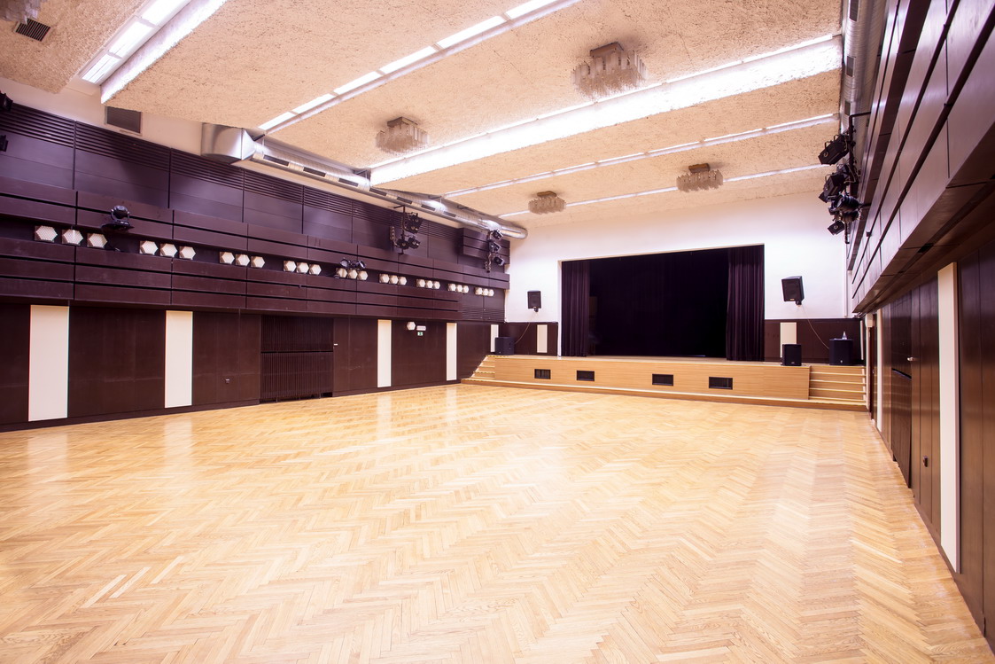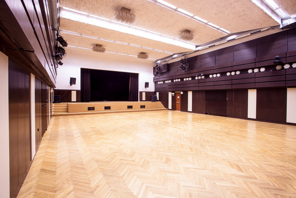 Popis: Velký sál je vybaven hudební aparaturou, klavírem (velké koncertní křídlo), klimatizací, k dispozici je ozvučení a světelná technika. Možnost uspořádání na divadelní sál s oponou a podiem nebo na schůze – k dispozici jsou stoly a židle. V předsálí je šatna, umývárna, sprcha, WC.