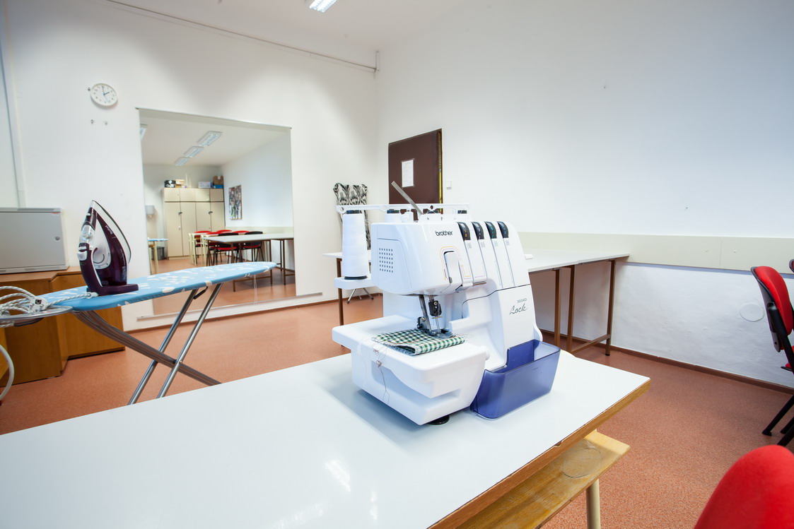 Popis: Učebna je vybavena 8 školními lavicemi a 16 polstrovanými židlemi. K dispozici jsou 4 šicí stroje a 1 šicí stroj overlock. Pro komfortní práci klientů je v přední částí místnosti velký stůl. Čelní stěna je zrcadlová. V zadní části místnosti je zabudováno umyvadlo.