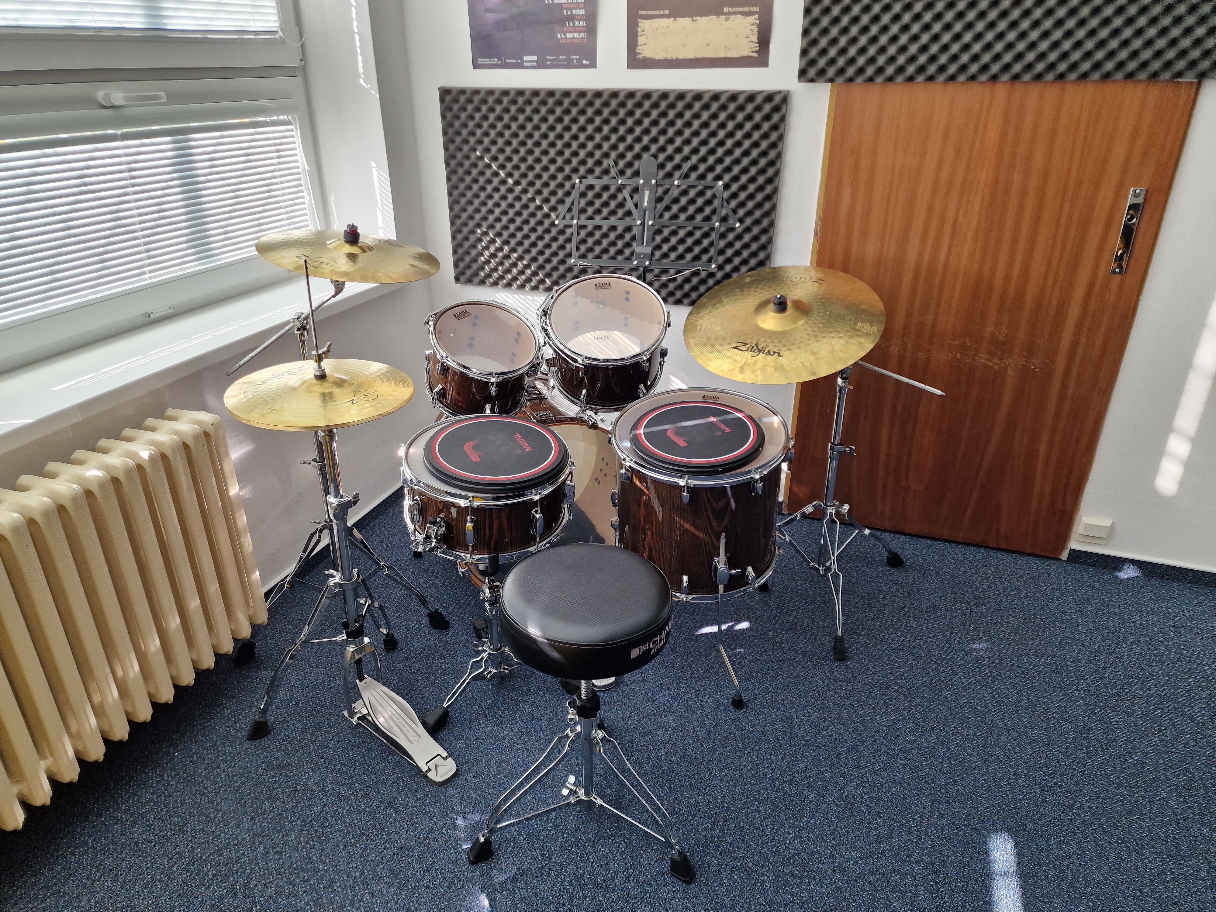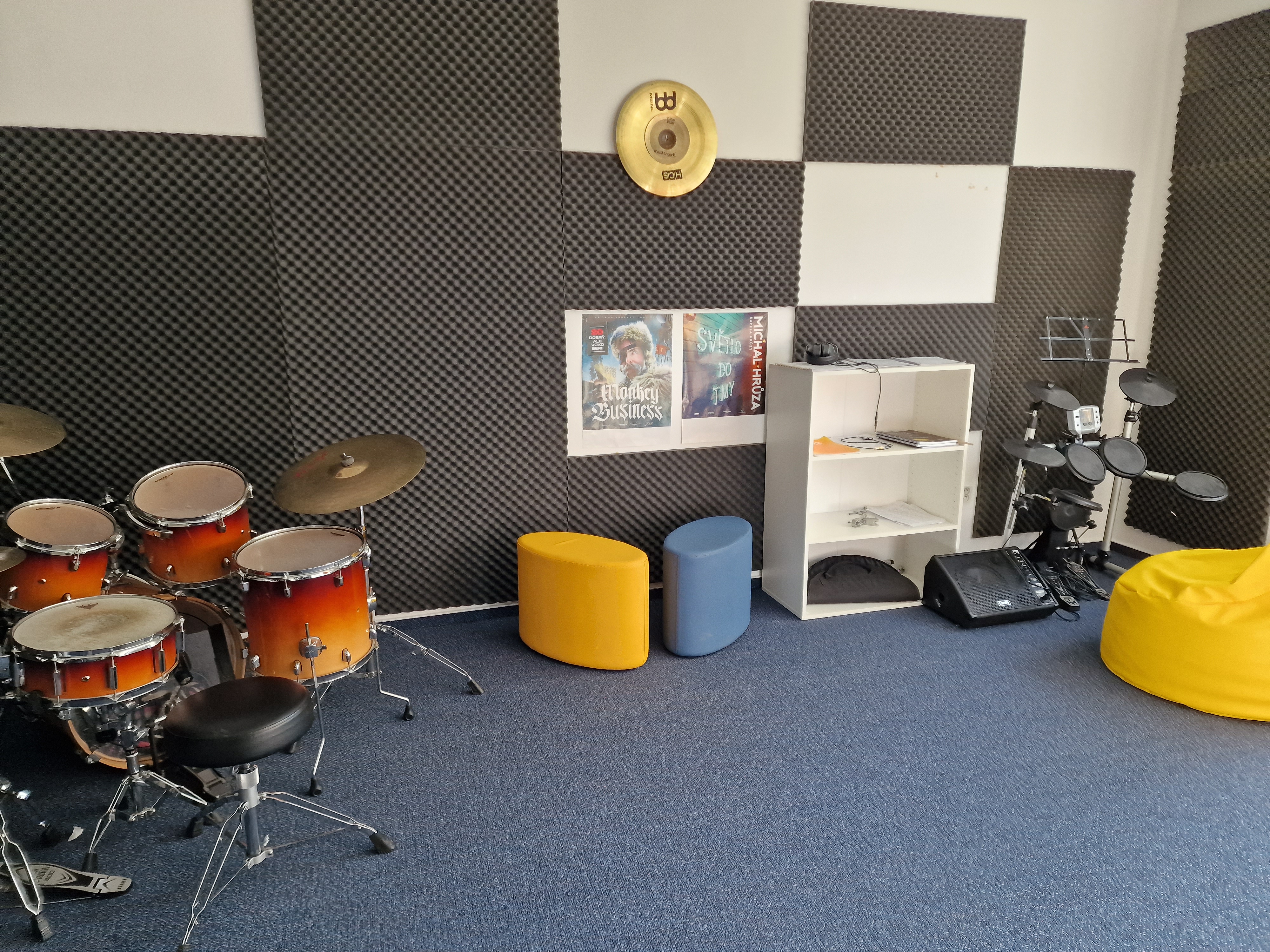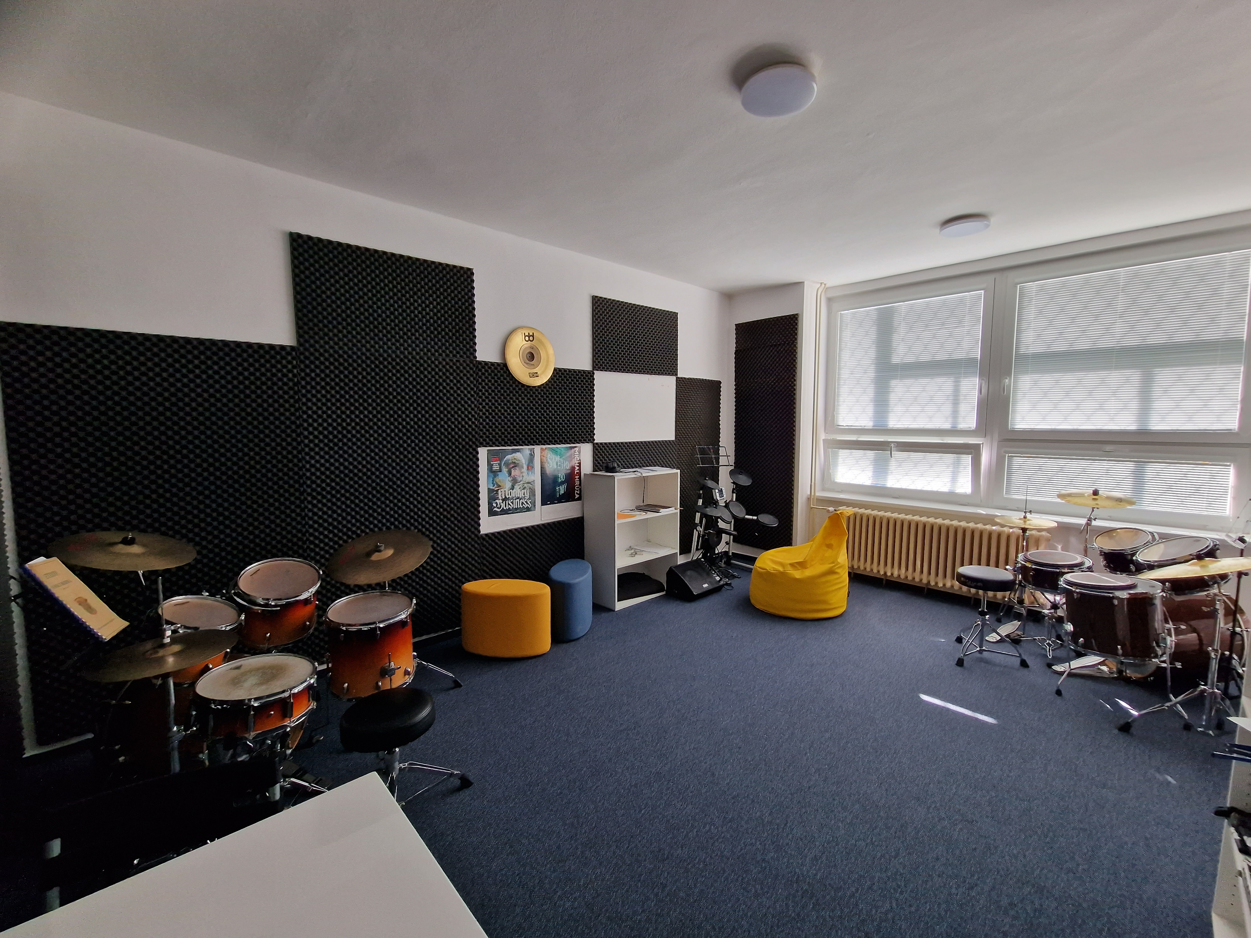 Popis: Místnost primárně využívaná k výuce bicích nástrojů, je vybavena dvěma kompletními bicími soupravami a dalšími pomůckami (pady, dřívka atd.). K dispozici jsou také elektronické bicí a elektrické piano zn. Yamaha. Učebna má ideální akustiku uzpůsobenou pro výuku hudby.