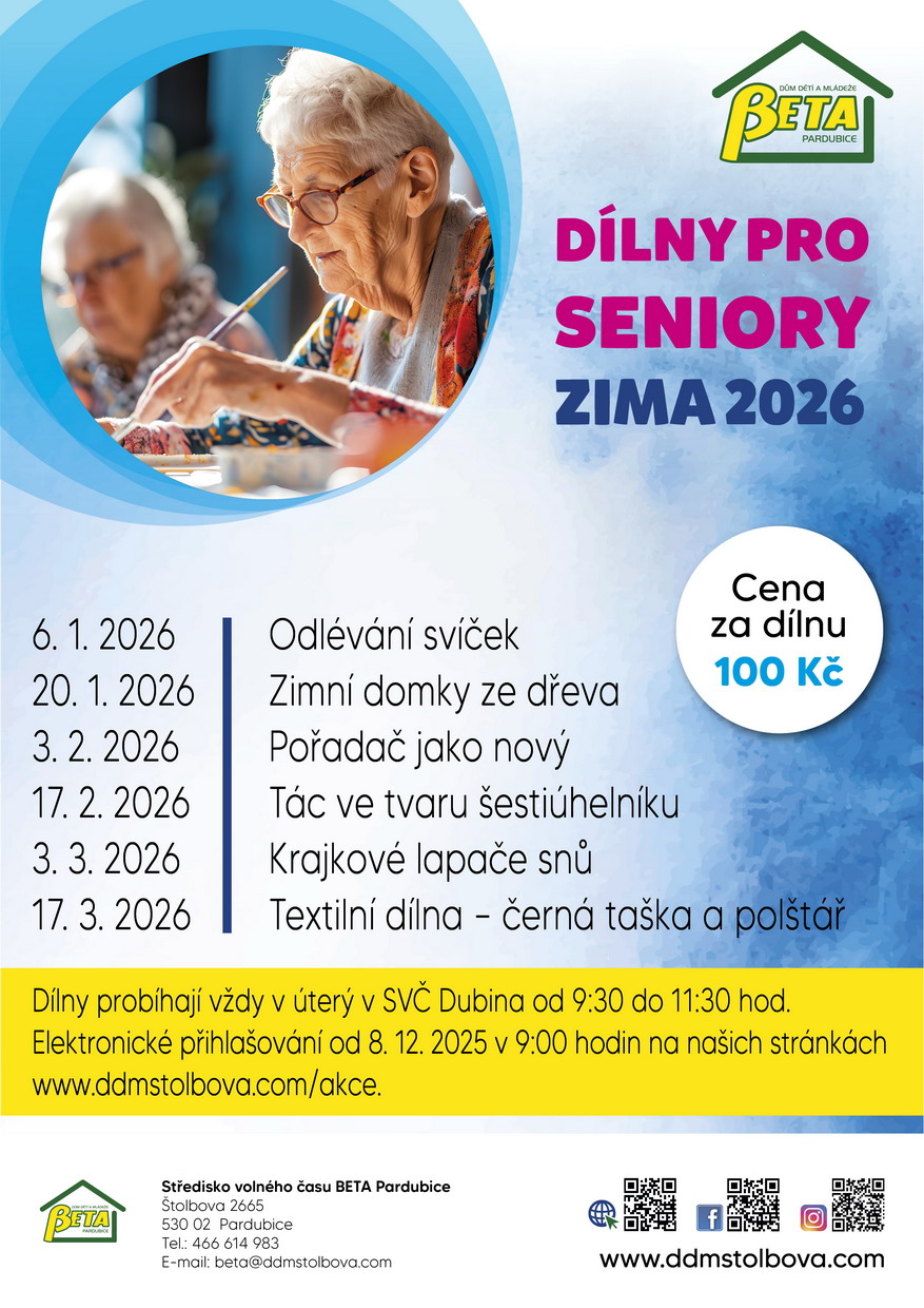 Tvůrčí dopolední dílny pro seniory, kde si v vyzkoušíte řadu tradičních i netradičních výtvarných technik a vytvoříte si tak neobvyklou dekoraci do svých domovů. Tyto workshopy pořádáme ve spolupráci s oddělením kultury a cestovního ruchu odboru školství, kultury a sportu Magistrátu města Pardubice.Neváhejte a přijďte mezi nás. Nudit se rozhodně nebudete.